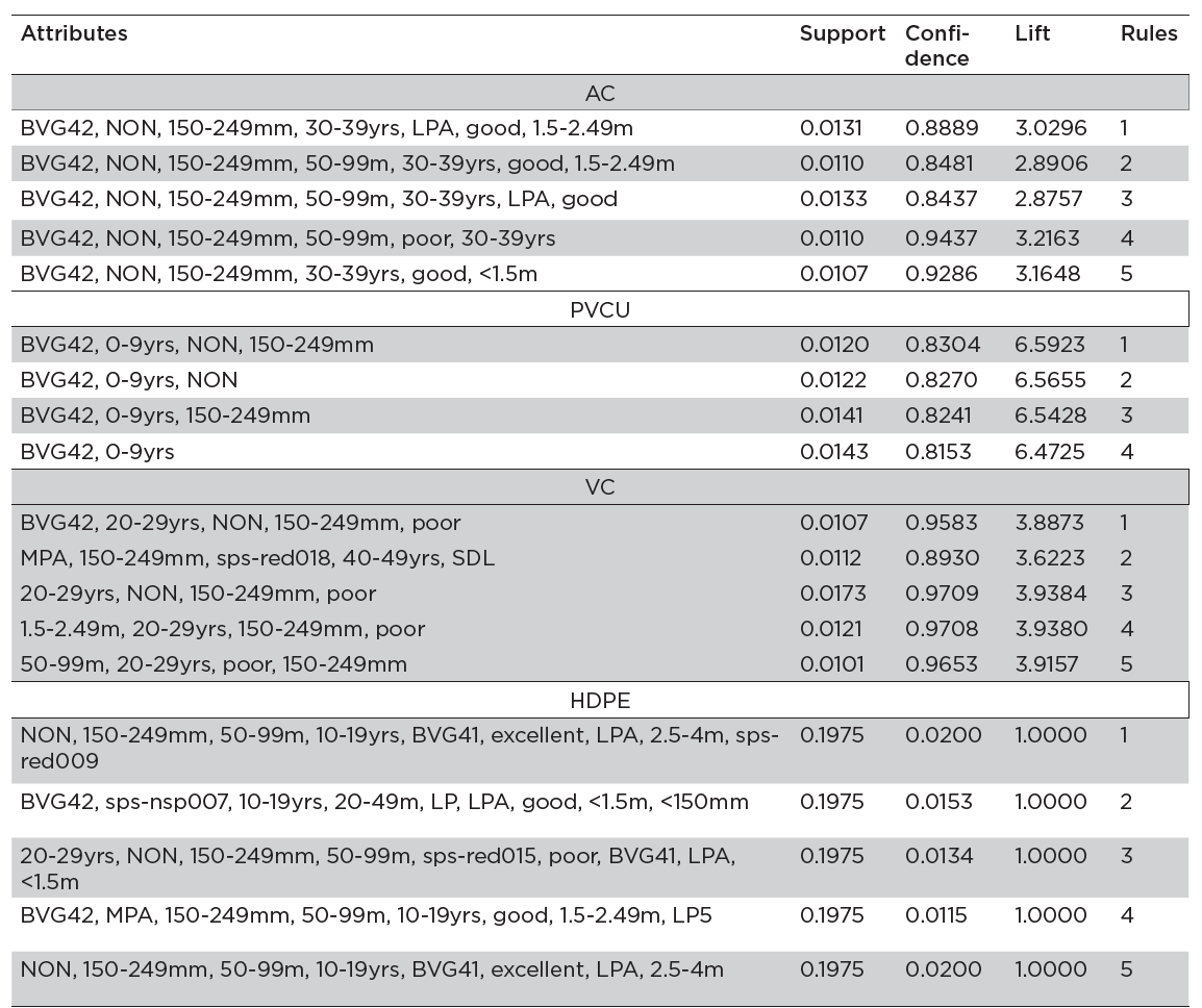 ARM discovers the pattern of frequently occurring events in records to facilitate the understanding of correlations (Nahar et al. 2013, Tandan et al. 2021) and inform decisions about future event trends. In this study, ARM has been employed to understand the pattern of occurrence of WWM attributes in BRCs to facilitate maintenance planning, design and renewal of WWMs. The association rule existing between the BRCs and WWM attributes Xatt is expressed as Xatt→BRCs for Xatt (antecedent) and BRCs (consequent) denoted as disjoint sets. The effectiveness of the rules was measured with Eqn. (6) that depends on the frequency of occurrence (Freq) to compute support, confidence and lift. Since VHBR category of the BRCs is the major cause for concern, the patterning rules was focused on the VHBR attributes of the WWM materials such as AC, VC, HDPE and PVCU using the confidence of 0.8 and support of 0.01. Using this level of support makes it possible to capture the majority of WWM attributes that will influence the BRCs, hence, capturing the impacts of minority attributes. The count of the antecedent’s attributes formed part of the decision for accepting a rule because the more the attributes, the better representation of BRCs contributing factors. Hence, a better consideration of the true impact of such attributes on blockage. Prior to the execution of ARM, the continuous features such as age, length, depth, and diameter of the WWMs were categorised.