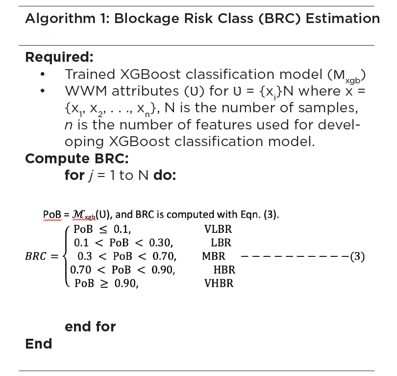 Estimating BRCs is vital for optimal management of WWMs. Since blockage can be attributed to different factors such as material, soil type, slope, soil acidity, and vegetation (Ossola et al. 2023, Okwori et al. 2021), knowing the BRCs enhances the understanding of the combined effects of the various factors. To this end, understanding BRCs can be helpful in planning, prioritising and costing WWM PM in consideration of operational, physical and environmental attributes of WWMs. By relying on the trained model discussed in the previous section, the PoB was computed and then used for computing the BRCs as VLBR, LBR, MBR, HBR, and VHBR following algorithm 1.