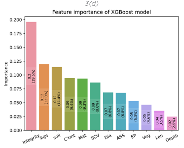 The predictive importance of the model ranged from 2.5% to 19.6% with integrity, age, and soil being the three most prominient features impacting blockage. Even though predictive feature importance is a localised measure of a model’s influential features, it can give comparative information of the features that contribute to blockage.