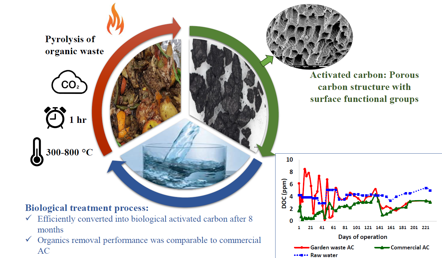 A long-term continuous filtration operation was performed in the School of Engineering, Deakin University and completed in July 2024. A systematic approach was considered for AC production, involving carbonisation and activation within a temperature range of 300 to 800 °C. The production parameters were optimised to improve the physicochemical properties of AC to be applied as an adsorbent. Five different carbon media including garden-waste-derived-AC, commercial AC and biological activated carbon with pre-established biota (BAC) were used to understand their biofilm holding capacity and performance to remove NOM from a drinking water source. During the initial phase of operation, garden-waste-based AC experienced significant fluctuations in the dissolved organic carbon (DOC) removal, however, it ultimately achieved steady DOC removal within the same timeframe as commercial AC. After 8 months of operation, garden-waste-based AC successfully supported biofilm formation evidenced by the effluents’ steady DOC, scanning electron microscope (SEM) and fluorescence imaging. Notably, the DOC removal performance by garden-waste-based AC was comparable to commercial AC, despite having a much smaller surface area. Moreover, garden-waste-based AC showed an outstanding performance in removing UV-absorbing substances including the aromatic NOM content of water, particularly within the molecular weight range of 100-4000 Da. This research offers important insights into the conversion of waste-based AC into biological AC for removing NOM from drinking water sources, exemplifying a clear avenue for increased circularity of resources within the water industry.