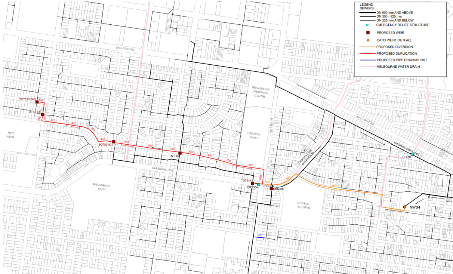 The 2022 master plan report indicated that under existing network and population conditions, non-compliant wet weather flooding is predicted at ten maintenance holes in the Tottenham branch sewer during a one-in-five-year weather scenario and a controlled spill at the emergency relief structure (ERS), ERS354, that would eventually discharge into Maribyrnong River. This was due to a hydraulic capacity deficiency in the 450 mm diameter sewer between TOT34A and TOY535-26G (over a length of approximately 1.3 km), posing a risk of a spill into the environment. These locations can be seen in Figure 2 below.