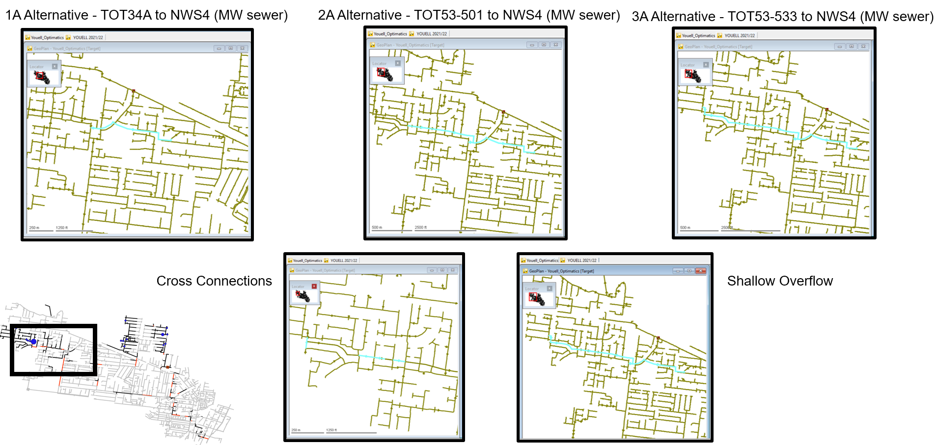 For the optimisation study, Alternative 3A was also broken down to different options that varied from each other (1A, 2A, Cross Connections and Shallow Overflow). These alternatives were evaluated during optimisation runs and could be selected randomly by the platform to be kept or substituted.