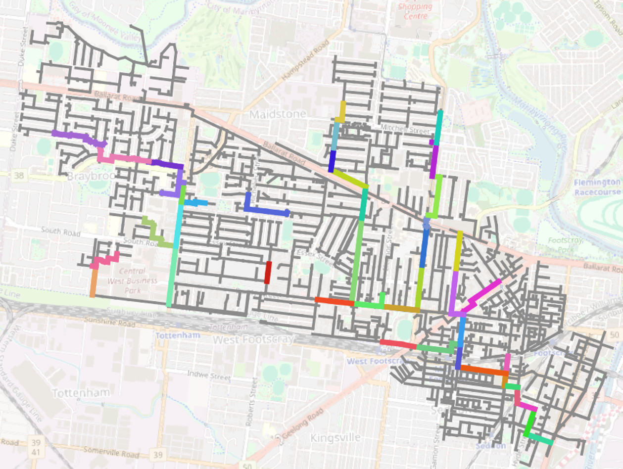 Figure 4 – Groups of pipes where the decision of “Leave Existing” or “Upsize” was available. Each colour represents a group of pipes in the network. Optimisation evaluations on the cloud.
