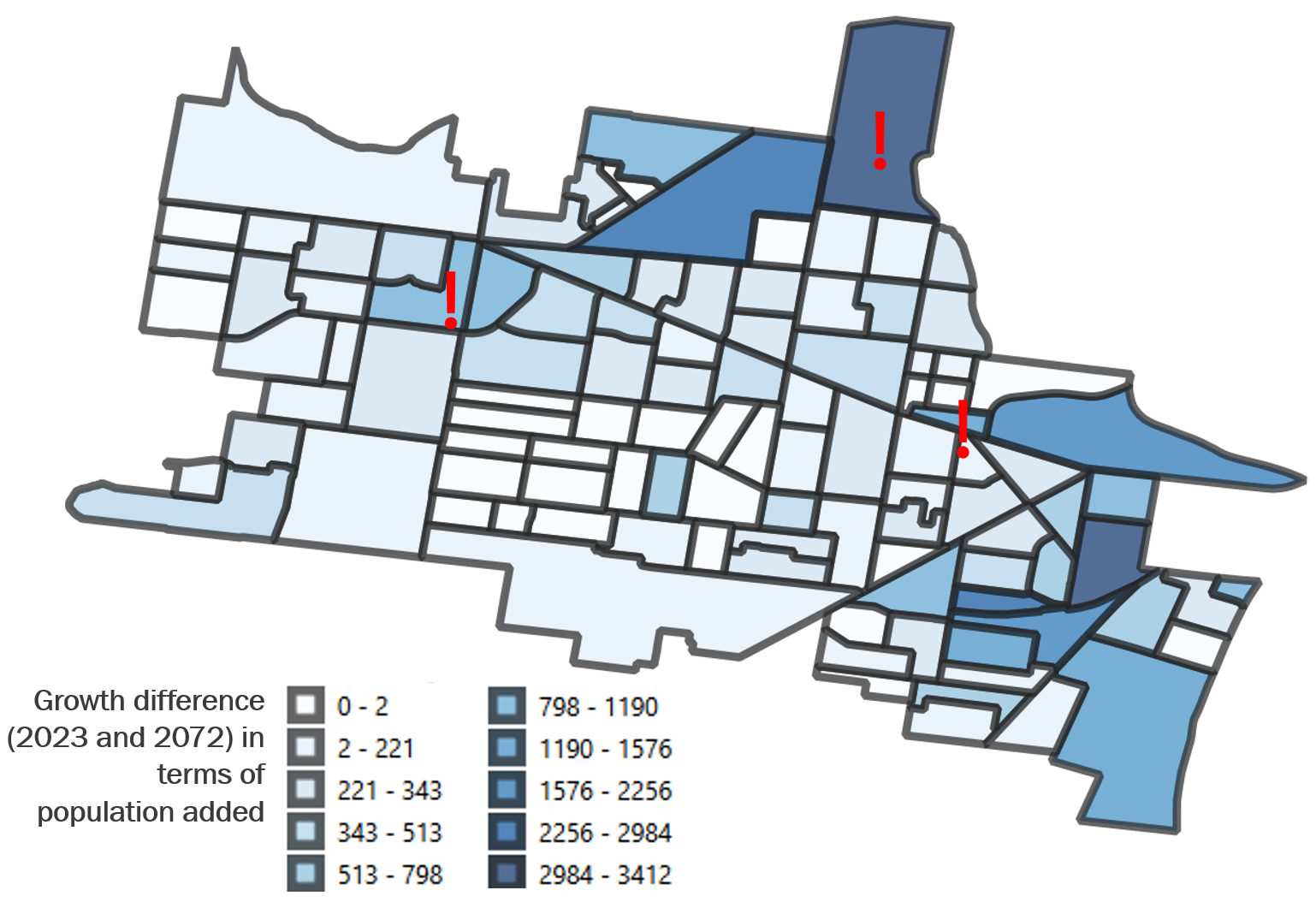 These results were compared with the growth projections provided by GWW, revealing that some high-growth sub catchments coincided with areas of high “Leave Existing” percentages, highlighting potential vulnerabilities (Figure 6).