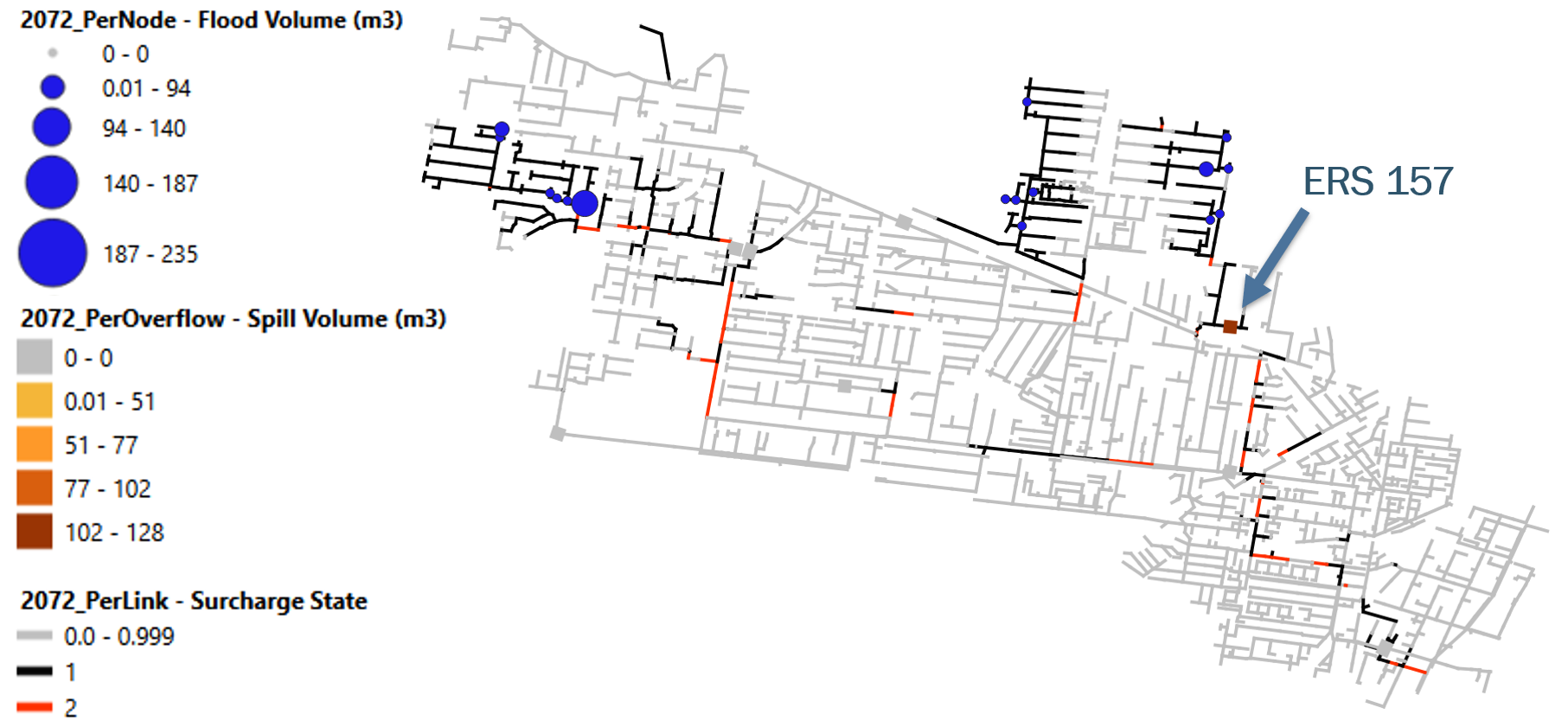 Figure 7 - Surcharge, flood and spill volumes | 2072. Scenario with 2072 projection presents several flood areas and intensification of spill volume at ERS157.