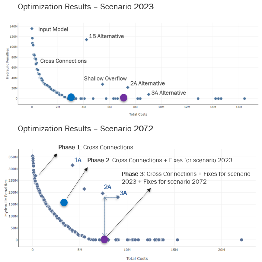 In the optimisation evaluations, the solution plan initially developed by GWW corresponded to option “3A Alternative”. Other variations from these solutions were added to the evaluations (1A/1B Alternative, Cross Connections, Shallow Overflow, 2A Alternative) and were analysed against the optimisation plans, having penalties and implementation costs being calculated consistently with the same methodology throughout all solutions (both optimised and manually developed). The manually developed solutions and the optimised solutions were plotted in terms of hydraulic penalties and total estimated costs (Figure 8). Given the optimised solutions, a manual analysis of the results was performed where optimal solutions for the 2023 and 2072 scenarios were combined to create stepwise solutions (displayed in Figure 8 as blue and purple markers).